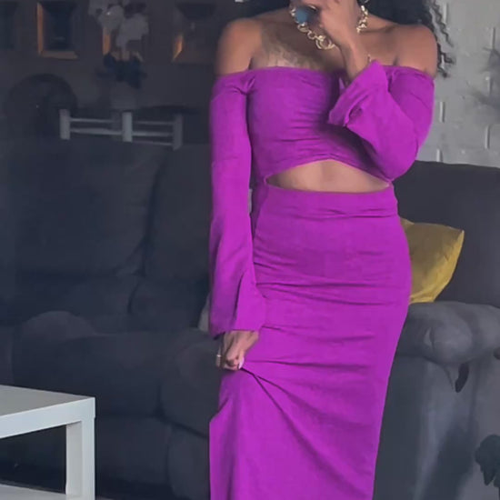 This maxi dress showcases a sleek cutout at the upper midriff and long, dramatic bell sleeves that add a touch of vintage charm. Effortlessly chic and made to make an impression.