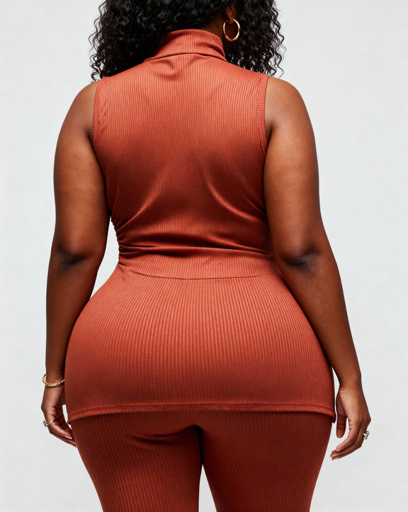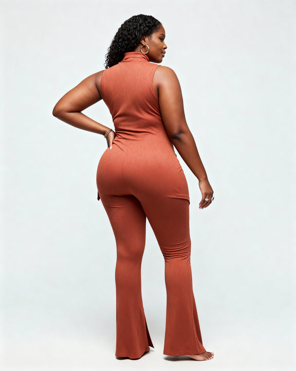 A sleek ribbed pant set designed to hug your curves with all-day stretch. The mock-neck top pairs with matching flare bottoms for a chic, put-together look you can wear anywhere.