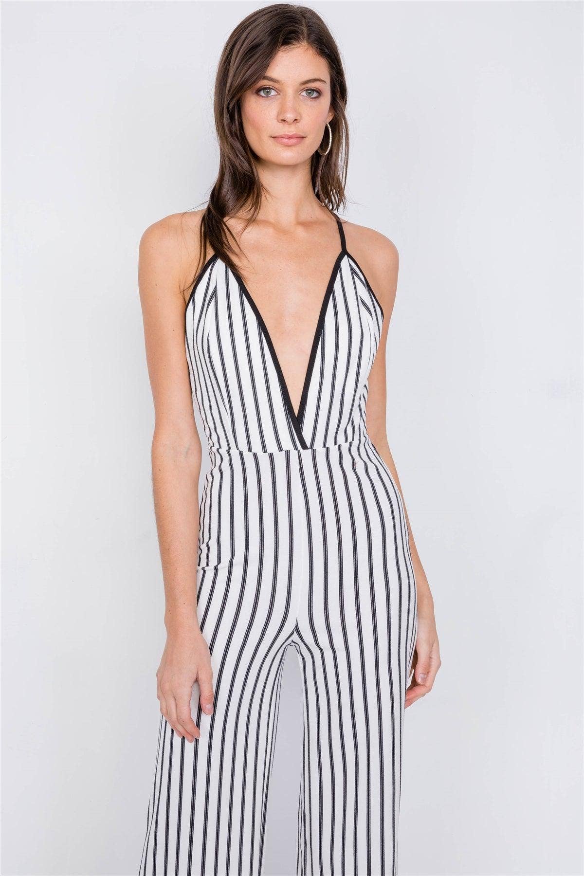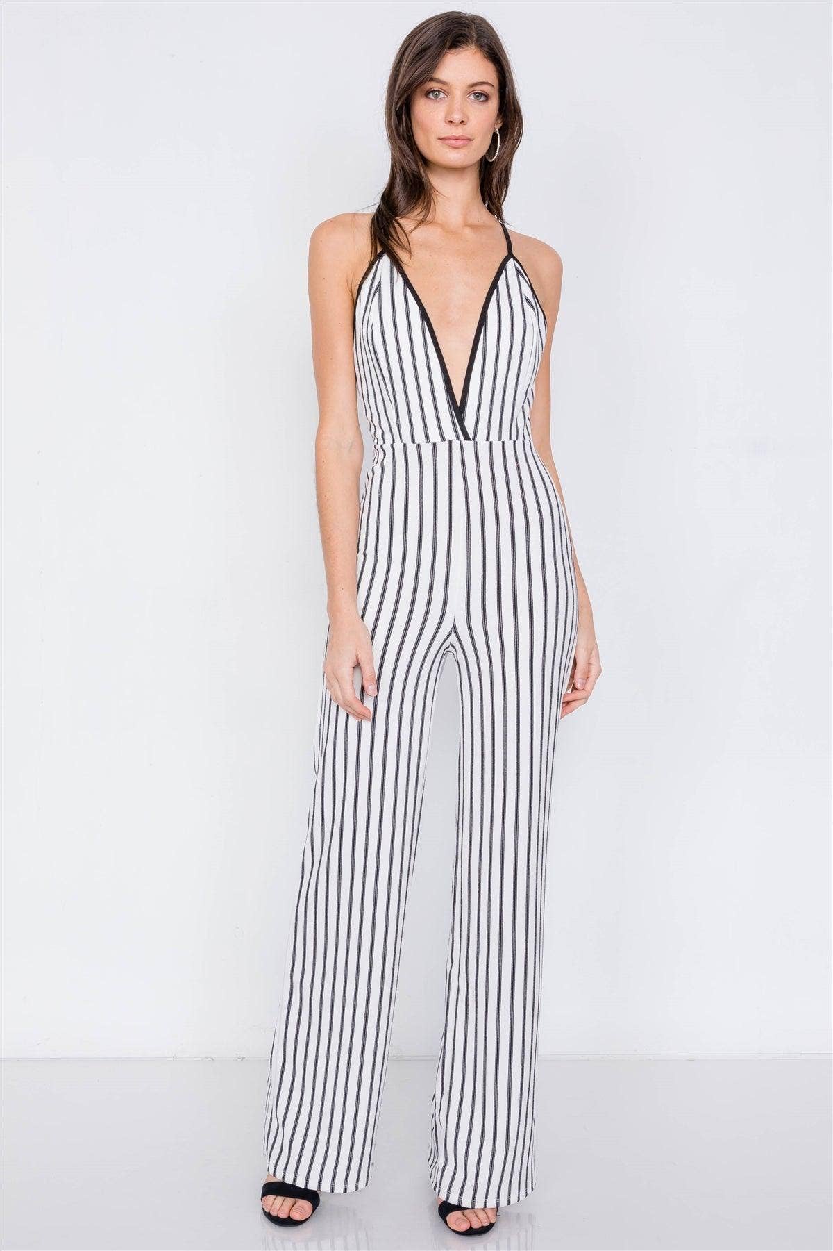 White & Black Trim Stripe V-Neck Criss-Cross Strap Back Jumpsuit